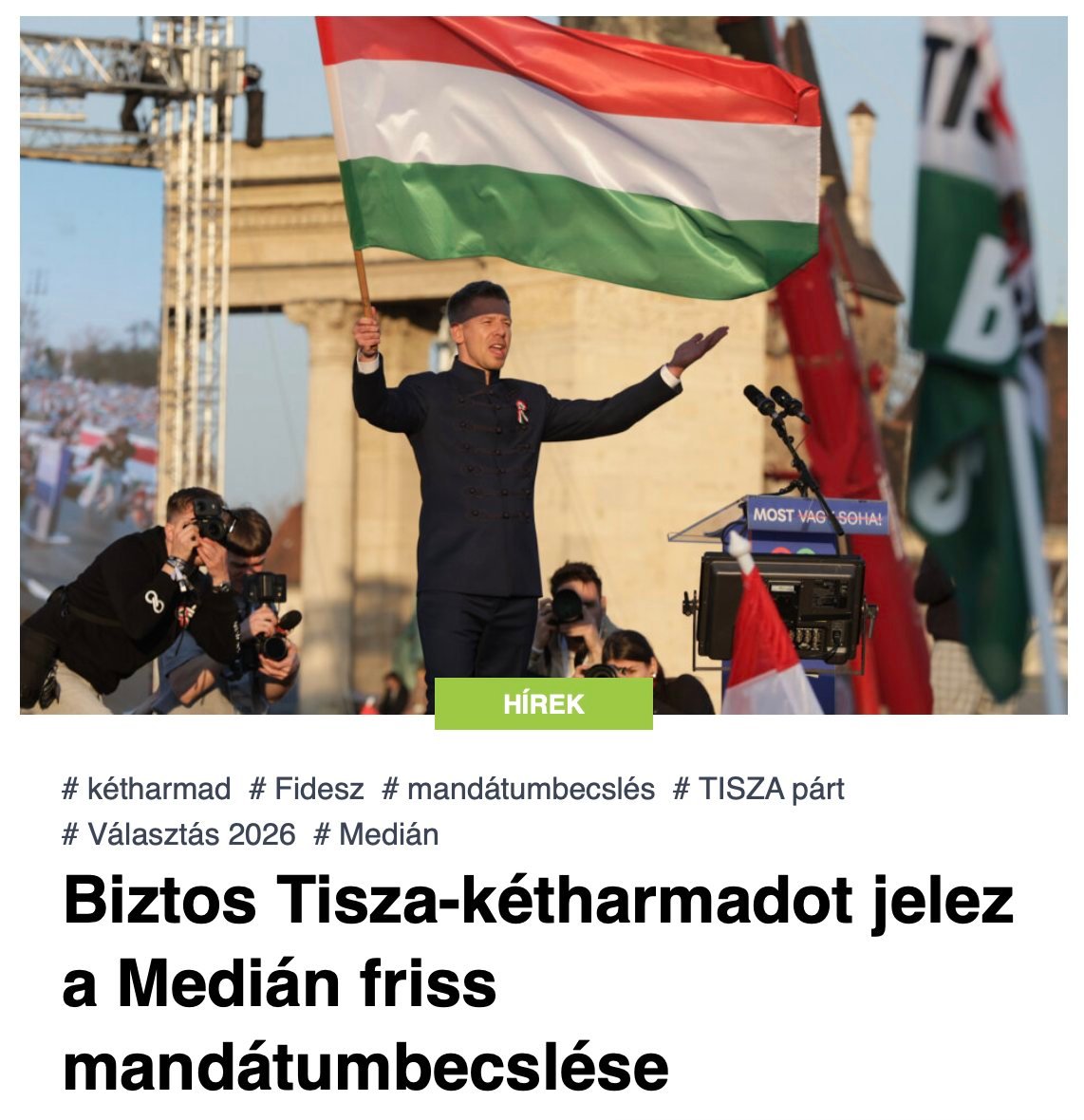 A Medián legfrissebb mandátumbecslése szerint a Tisza Pártnak 138-143 képviselője lehet az Országgyűlésben, ami sima kétharmados többséget jelentene. A kutatás alapján a Fidesz 49-55 képviselői helyre számíthat, a parlamentbe pedig rajtuk kívül még a Mi Hazánk juthat be 5 vagy 6 mandátummal.
