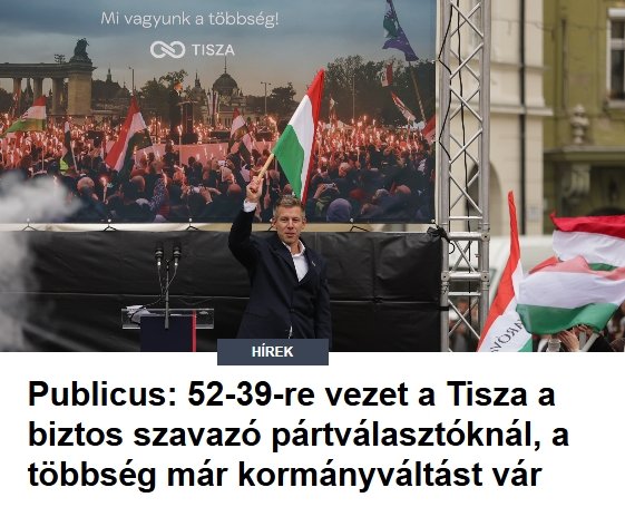 A Tisza Párt a biztos szavazó pártválasztók körében 52-39-re vezet a Fidesz előtt, és minden vizsgált kategóriában növelte előnyét – derül ki a Publicus Intézet utolsó, a választás előtt készített felméréséből.
